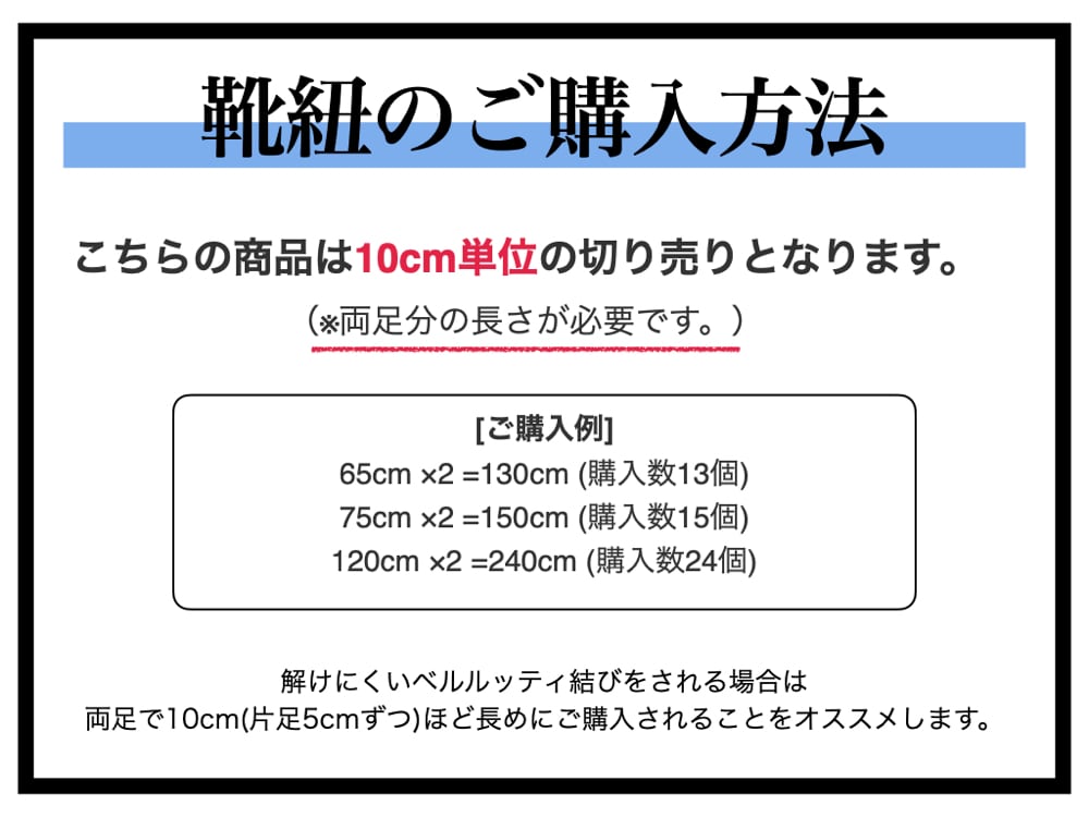 (例:片足65cmの靴紐をご購入の場合は1m30cmの長さが必要ですので、数量を13個にしてご注文ください。)