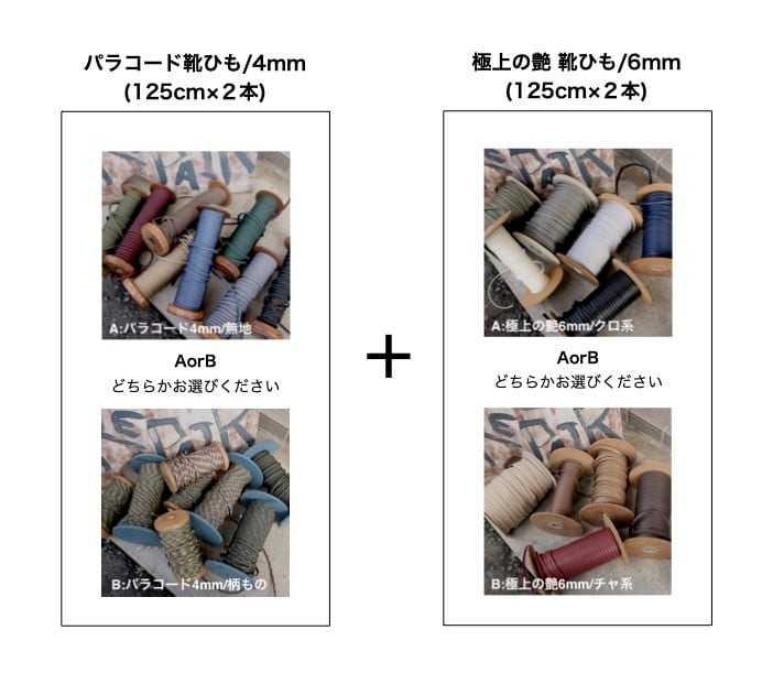 パラコード靴紐(AorB)1種、極上の艶靴紐(AorB)1種をお選びください。