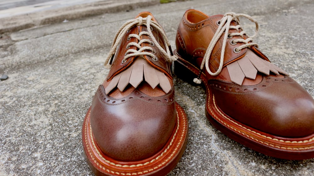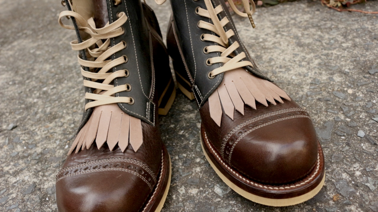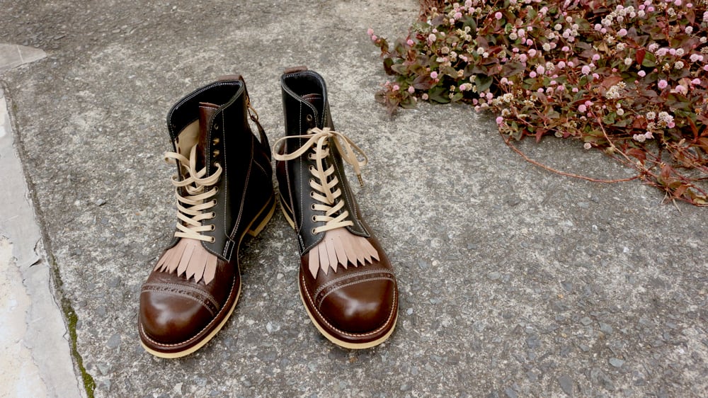ブーツや外羽根シューズの一番下のシューホールに靴紐で通して装着します。